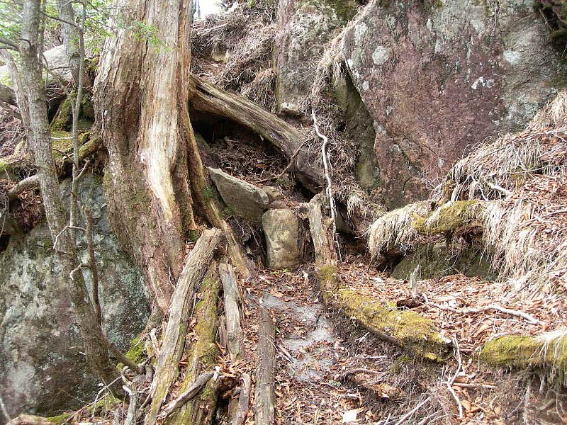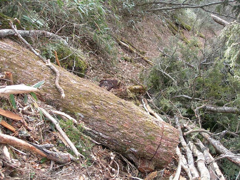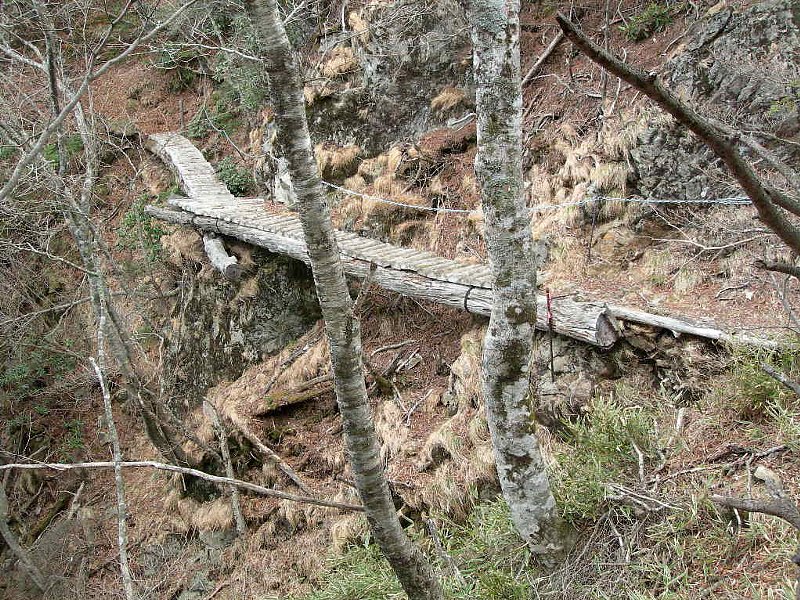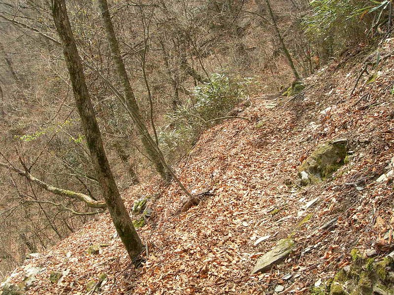 山に入ってまず驚いたのは、道が見えないこと。枯葉が踏まれて色が変わった道筋が、何となくうっすらと見えるだけです。幅も30cmあるかないか。しかも道が傾いている上に、かなりの急勾配です。うっかり足を滑らせたら、谷底までノンストップで滑り落ちそうです。実は、高尾山の2~3倍程度、よくて5倍程度のきつさかと思っていました。なめてました。猛省です。高尾山と比べられるものではありませんでした。イヤーな予感は的中でした。崩れた岩や木で道がふさがれている所や崖にかかった木橋、雪が残る箇所などリスキーな場面が多々あります。一番危険だったのは、道を間違えてしまった時でした。本来右に曲がらなければいけないところを、誤って直進してしまったのです。その時は、幸運なことに荷物運びのボッカさんに「そっちじゃないよ」と後ろから声をかけられて助かりました。あの時ボッカさんがいなかったら・・・と考えると、本当に怖いです。